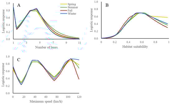Response curves of number of lanes (A), habitat suitability (B) and maximum speed (C) in each season for H. inermis using UVC data between 2019 and 2021 in the Republic of Korea. Each response curve of predicted probability is independent of other variables in the models.