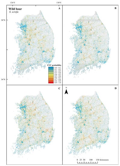 Season-based UVC probability predictions of S. scrofa in spring (A), summer (B), fall (C) and winter (D) along roads using UVC data between 2019 and 2021 in the Republic of Korea. Red and blue colors indicate a high and a low probability of UVC, respectively. The maps were generated using ArcGIS Desktop 10.8.1.