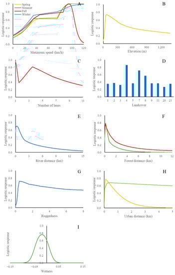 Response curves of maximum speed (A), elevation (B), number of lanes (C), landcover (D), river distance (E), forest distance (F), ruggedness (G), urban distance (H) and wetness (I) in each season for S. scrofa using UVC data between 2019 and 2021 in the Republic of Korea. Each response curve of predicted probability is independent of other variables in the models.