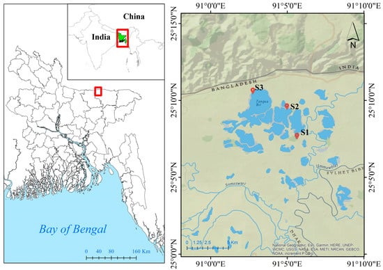 Tanguar Haor, known as “mother fishery”, is a nationally important wetland in Bangladesh. It is located in the Sunamganj district of Bangladesh, between 25°12′2.572″ to 25°5′47.989″ North Latitude and 90°58′49.426″ to 91°10′0.018″ East Longitude, covering an area of 160 km2 (Figure 1). It has a remarkably diversified biome, with 137 kinds of fish and 284 species of birds living in this wetland []. This haor supports the livelihoods of 88 villages and around 70,000 people in its surroundings. The Netrokona district, which is located west of the haor, is only around 2.5 km away. As sampling locations, three locations were chosen—Hathrigatha, Nainder Beel, and Lechuamara—where there was no evidence of river bank breaking and no sediment settlement. Tanguar Haor has a subtropical monsoon climate, with the three dominant seasons most likely being monsoon (July–October), summer (March–June), and winter (November–February). The summer months of April through June have temperatures between 30.9 and 33.4 °C. Temperatures in the winter, which last from October to February, range from 8.5 to 16.6 °C. The haor region receives 8000 mm of rain on average each year.