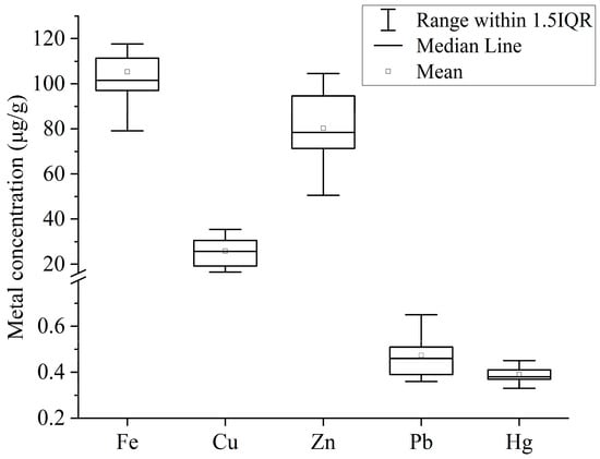 The Provisional Tolerable Weekly Intake (PTWI) set by the Joint Expert Committee on Food Additives (JECFA, 1.6 µg/kg) and the National Research Council (NCR, 0.7 µg/kg) of the United States was used to calculate the exposure level to human health []. Male and female average body weights in Bangladesh were judged to be 55.2 kg and 49.8 kg, respectively, and each person consumes 62.58 g of fish every day on average.