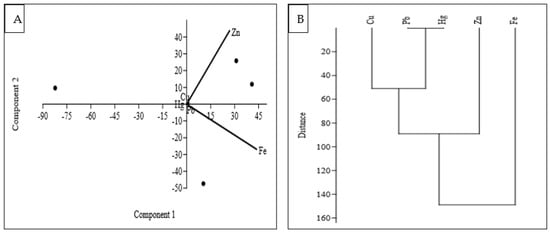 Loadings of PCA (A) and Dendrogram (B) of the studied PTEs in fish samples.