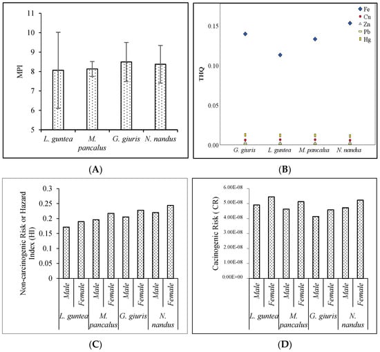 Figure 4B shows the target hazard quotient (THQ) of the five examined PTEs from consuming fish species. Fe > Hg > Cu > Zn > Pb were in decreasing order of the mean THQ, and the value of <1 for both adults and children suggests that adverse effects on human health might not occur. The HI or total target hazard quotient (TTHQ) scores followed the pattern of THQ. Further, average total target hazard quotient (TTHQ) values for the studied species followed the decreasing order of N. nandus > G. giuris > M. pancalus > L. guntea. However, the TTHQ values for each species were less than 1 (<1), suggesting that the fish were safe for human to consume (Figure 4C). The carcinogenic risks (CR) derived from the intake of Pb were calculated, and it was found that the values of CR ranged from 4.92 × 10−8 to 4.14 × 10−8 for males, and 5.45 × 10−8 to 4.59 × 10−8 for females (Figure 4D). However, the present findings revealed that the CR values for Pb did not exceed the standard limit (1.00 × 10−6), which specified that consumers of the studied species are not exposed to the cancer risk [].