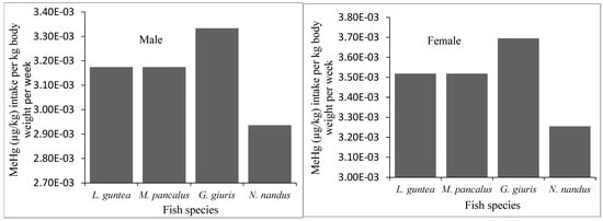 The projected intake of MeHg and the risk associated with the average consumption of fish by the local people was evaluated on the basis of the recommended provisional tolerable weekly intake (PTWI) for methylmercury, established by the Joint Expert Committee on Food Additives (JECFA, 1.6 µg/kg) and the National Research Council (NCR: 0.7 µg/kg) of the U.S [,]. In this study, the MeHg intake per week varied from 0.0029–0.0037 µg/kg body weight for both adult males and females (Figure 5). The weekly intake of MeHg was much below the limit of 1.6 µg/kg and 0.7 μg/kg bw/week set by the JECFA and the US-NCR, respectively. Therefore, the studied fish species were found to be safe for human consumption.
