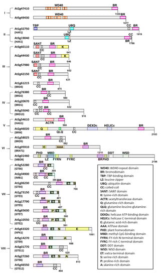 Domain architecture of Arabidopsis BRD-proteins. The relative length and conserved regions are depicted for each protein. Different domains are presented in different colors, and their names are explained at the bottom right corner. Phylogenetic clusters (adapted from [28]) are shown in brackets (I–VIII).