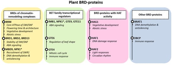 Plants encode a significant number of BRD-proteins, yet many of them are not characterized. We divided the studied plant BRD-proteins in functional groups: (a) BRD-proteins of chromatin-remodeling complexes; (b) BET family transcriptional regulators; (c) BRD-proteins with histone acetyltransferase activity; (d) other BRD-proteins (Figure 2). With this review, our aim is to concentrate the current literature on plant BRD-proteins and highlight similarities and unique features compared to animal or yeast counterparts, as well as key questions for future research.
