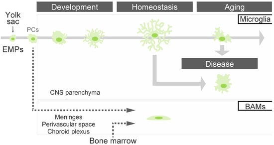 Microglia, the resident immune cells in the brain parenchyma, play a pivotal role in establishing optimal brain environments by regulating apoptotic cells clearance [1], neurogenesis [2], synaptogenesis [3], synapse pruning [4,5], neuronal differentiation [6,7], neuronal survival [8], synaptic surveillance [9], extracellular matrix maintenance [10,11], and vascular functions [12,13]. Microglia originate from early erythromyeloid progenitors (EMPs) in the yolk sac and migrate to the brain primordium through circulation [14]. After infiltration, these cells differentiate into various types of microglia. Recent advances in single-cell RNA sequencing (scRNA-seq) technology have made microglial temporal and spatial heterogeneities hot topics in this field. The gene expression signature in homeostatic microglia [15] differs from those in developmental [16,17,18], aging [19,20], and disease microglia, including neurodegenerative disorders [21,22,23,24,25] and brain tumors [26]. In addition to microglia, omics analyses have unveiled the existence of various macrophages in the border region, known as border-associated macrophages (BAMs) or CNS-associated macrophages (CAMs) (hereafter referred to as BAMs) [27,28,29,30]. BAMs reside in the non-parenchymal CNS interface, such as the meninges, perivascular region (Virchow-Robin space), and choroid plexus. BAMs share some gene expression signatures with microglia in the brain parenchyma but also have distinct and characteristic gene expression profiles. Recent findings suggest that the differences in transcriptome profiles between microglia and BAMs are due to differences in their origin or niche [31].