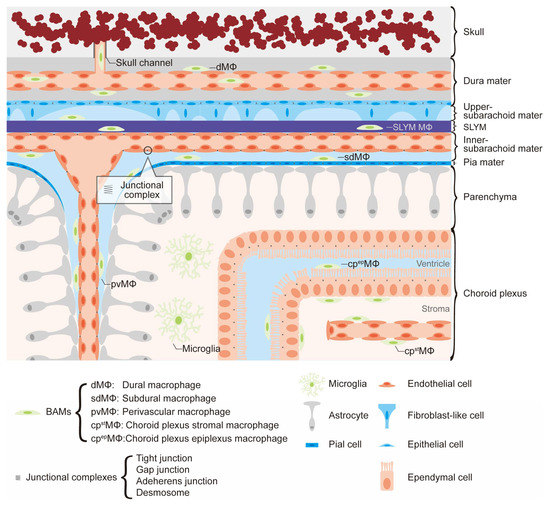 Recently, a fourth membrane in the meninges, known as the subarachnoid lymphatic–like membrane (SLYM), was identified [52]. The SLYM is situated between the arachnoid and the pia mater. The gene expression signature of SLYM cells exhibits characteristics similar to those of the lymphatic marker, Pdpn, but not Lyve1. Although the precise biological significance of the SLYM is still being investigated, it may play a role in facilitating the transfer of small molecules between the CSF and venous blood. Notably, myeloid cells were identified within the SLYM, and their abundance increases in both lipopolysaccharide (LPS)-treated and aged mice. For instance, the SLYM was found to contain CD206+ and Lyve1+ macrophages with dendritic cells. The presence of resident CD206+ and Lyve1+ macrophages and dendritic cells within the SLYM suggests the existence of a novel subset of BAMs composed of these myeloid cells.