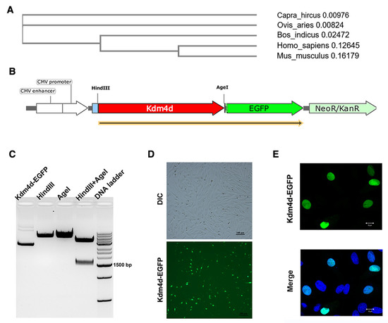 Cellular localization of Kdm4d in goat fibroblast cells. (A) Evolutionary tree generated from Kdm4d protein sequences from different species; (B) schematic diagram of overexpression fusion vector construction; (C) the product after constructing the overexpression vector using gel electrophoresis; and (D,E) the cellular localization of Kdm4d in goat fibroblast cells using immunofluorescence.