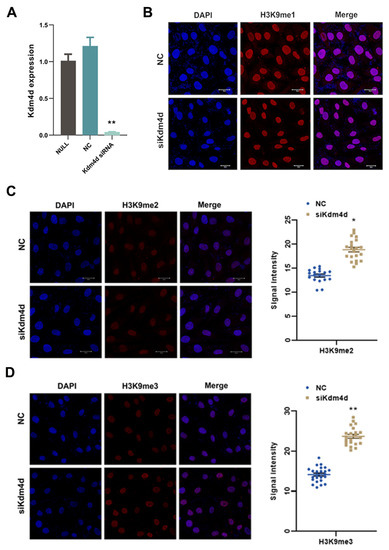 We next performed the knockdown of Kdm4d. As shown in Figure 2A, the expression of Kdm4d was decreased in Kdm4d knockdown GFCs, as revealed with qPCR (p < 0.01). The levels of H3K9me2 and H3K9me3 were elevated (p < 0.05, Figure 2B–D), while the signal intensity of H3K9me1 was not significantly different in Kdm4d knockdown GFCs compared to the controls. These data suggest that Kdm4d was successfully knocked down, which led to the observed higher level of H3K9me2/3 in GFCs.