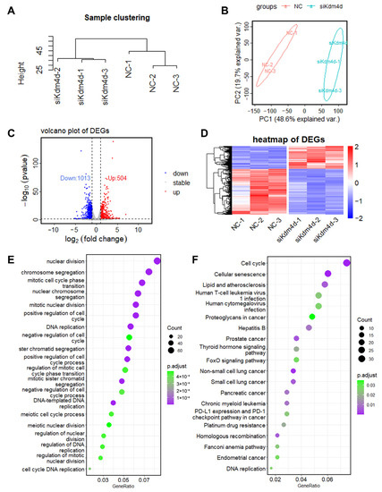 The transcription profile of Kdm4d knockdown goat fibroblast cells. (A) Sample cluster map; (B) principal component analysis (PCA); (C) volcano plot of the DEGs in normal goat fibroblast cells and Kdm4d knocked-down goat fibroblast cells; (D) heatmap of the differentially expressed RNAs in Kdm4d knockdown goat fibroblast cells; and (E,F) GO and KEGG enrichment analysis of the DEGs.