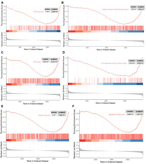 GSEA analysis revealing the critical pathways associated with the cell cycle. (A–F) The down-regulated genes were enriched in DNA replication, cellular response to the DNA damage stimulus, DNA repair, ATP-dependent activity, acting on DNA, the mitotic cell cycle, and in the regulation of the cell cycle pathway as revealed from GSEA analysis.