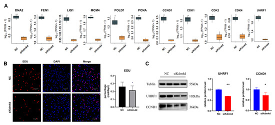 DNA replication is one of the important parts of the cell cycle. We next studied the role of Kdm4d in the cell cycle. As shown in Figure 5A, the expression of the DNA repair-related gene DNA2, DNA genetic stability-related gene FEN1, DNA ligase-related gene LIG1, DNA replication-initiation-related gene MCM4, DNA replication-associated gene POLD1, and cell proliferation-associated gene PCNA was decreased in Kdm4d knockdown GFCs (p < 0.05). Moreover, the cell proliferation rate showed a significant decrease in Kdm4d knockdown GFCs compared to the NC group (p < 0.05, Figure 5B), as revealed from the EdU cell proliferation assay. To further investigate whether Kdm4d directly affects the cell cycle, we examined the expression of cell cycle-related genes. As shown in Figure 5A, the expression of CCND1, CDK1, CDK2, CDK4, and UHRF1 were significantly decreased after the knockdown of Kdm4d (p < 0.01). The protein expression levels of UHRF1 and CCND1 were significantly decreased in the Kdm4d knockdown group (p < 0.05, Figure 5C and Figures S1–S3), suggesting that Kdm4d is important in regulating the cell cycle process of GFCs. Our data indicate that interfering with Kdm4d is essential for the proliferation of GFCs.