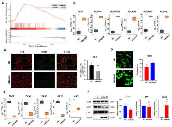 Kdm4d regulates the antioxidant capacity of goat fibroblast cells. (A) GSEA analysis enriched the oxidative phosphorylation pathway; (B) the expression of genes associated with oxidative phosphorylation in Kdm4d knocked-down goat fibroblast cells; (C) mitochondrial membrane potential changes in Kdm4d knocked-down goat fibroblast cells using JC-1; (D) real-time reactive oxygen levels in goat fibroblast cells after Kdm4d knockdown; (E) the expression of genes associated with antioxidation in Kdm4d knocked-down goat fibroblast cells; and (F) the expression of antioxidant-related proteins in Kdm4d knocked-down goat fibroblast cells. ns denotes a non-significant difference, * denotes a significant difference at p < 0.05, ** denotes a significant difference at p < 0.01, *** denotes a significant difference at p < 0.001.