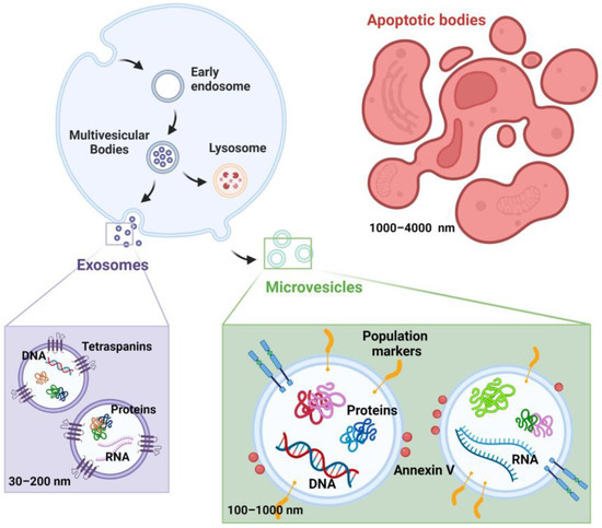 Summary of the EVs (apoptotic bodies, exosomes, and microvesicles) biogenesis, size ranges, surface markers, and cargo. The figure was created through “biorender.com” web site (license agreement number HD25P4J1RM), access date 6 August 2023.