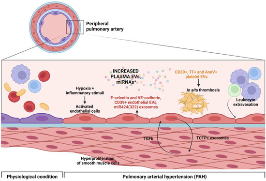 EVs have been studied as potential biomarkers for several aspects of both PAH and CTEPH. For example, circulating EVs derived from different cell types are increased in PAH patients [36,37,38,39] and the amount of EVs correlates with functional impairment [38] and mortality [40]. More recently, Kosanovic et al. demonstrated for the first time the augmented T-cell-derived EVs in PH patients suggesting that PAH represents an “inflammatory disorder” in which inflammatory cells are accumulated in the lung and in remodeled pulmonary vasculature [41]. Drug treatment for PAH with prostacyclin analogues (epoprostenol, treprostinil, and iloprost) can inhibit EVs release from platelets and leukocytes [42,43]. A recent study that enrolled 70 patients with PAH shows an increased number of activated platelets- (CD62P+), endothelial- (CD144+) and erythrocytes- (CD235a) derived EVs compared to healthy controls. Of interest, endothelial cell-derived EVs were higher in PAH patients’ urine samples compared to controls and their levels increased with the Tricuspid Annular Plane Systolic Excursion (TAPSE), a key prognostic predictor for PH [44]. In addition, proteomes analysis allowed the identification of 13 proteins differentially expressed, highlighting that EVs from PAH patients contain higher levels of proteins involved in angiogenesis (such as complement C1q and ceruplasmin) [37]. This group showed that the EVs purified from patients with PAH had the potential to provoke surface adhesion markers and oxidative stress—signs of endothelial dysfunction—and to promote pro angiogenic effects on human pulmonary artery endothelial cells in vitro. Another study found that increased levels of endothelial-derived exosomes in IPAH patients has diagnostic potential [45]. Circulating endothelial-derived EVs (EEVs), formerly indicated as microparticles (MPs), have been reported as markers of endothelial injury and systemic vascular remodeling [46] and have been correlated with the degree of endothelial dysfunction in patients with renal and cardiac diseases. PH patients had increased levels of EEVs expressing E-selectin, VE-cadherin and PECAM [37]. PECAM+ and VE-cadherin+ EVs positively correlate with the mean pulmonary artery pressure (mPAP) and brain natriuretic peptide (BNP) of PH patients, underlying the potential of EEVs as biomarkers of hemodynamic severity of the disease. Indeed, high levels of E-selectin EEVs correlate with poor outcomes or death [40]. A recent study demonstrated the presence of small non-coding RNAs carried by EVs and their possible use as diagnostic and prognostic markers of CTEPH. Among the sncRNAs that were differentially expressed, DQ593939 (a PIWI-interacting RNA-piRNA) correlated with individual clinical parameters (such as mPAP and NT-proBNP) and therefore can be indicated as a potential biomarker for CTEPH [47]. Along with their possible role as biomarkers, EVs have been investigated also as potential actors in PH pathogenesis [43,48,49]. During the development of PAH, a luminal obstruction due to vascular remodeling of the peripheral pulmonary arterial circulation occurs.