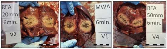 Example of sectioned liver specimen along the axis of the coagulation zones at 6 min for RFA 20 mm setup (confluent CZ), MWA, and RFA 50 mm setup (individual CZ). A ruler of 5 cm in each bottom right corner with correct proportions.