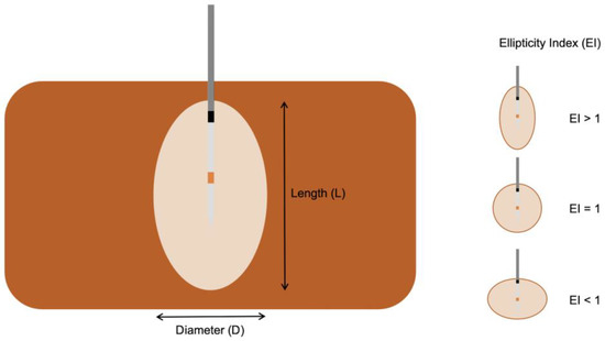 The coagulation zone dimensions were measured using a Vernier caliper. The diameter (D) was defined as the maximal diameter of the ablation zone measured in the plane perpendicular to the ablation probe. The length (L) was defined as the distance between proximal/distal edges of the ablation zone in the axis of the ablation probe. Ablation volumes in mL (assuming an ellipsoidal shape) were calculated using the formula (4/3 × π × a × b × c). Ellipticity indices (EIs) were calculated using the formula: L/D [14]—see schematic illustration Figure 3.