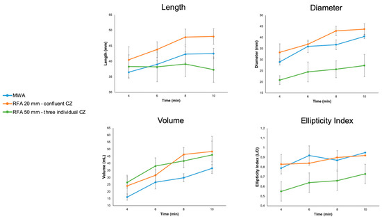 Overall results with mean values of length, diameter, volume, and ellipticity index for different ablation systems and times are summarized in Table 1 and illustrated in Figure 4.