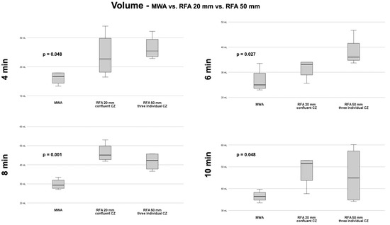 When comparing all volumes regardless of system and ablation time, the largest ablated volume was achieved using the RFA 20 mm (confluent CZ) setup at 10 min with 48.4 ± 7.3 mL.