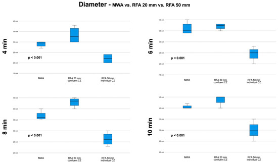 Overall, the largest diameter was achieved with the RFA 20 mm setup at 10 min ablation time with 43.8 ± 2.5 mm. Diameters differed significantly between systems/setups for all evaluated ablation times (4 min [p < 0.001]; 6 min [p < 0.001]; 8 min [p < 0.001]; 10 min [p < 0.001]). Post hoc analyses revealed significant differences between the RFA 50 mm setup (diameter of a single CZ) compared with the other two systems/setups for all ablation times. Between MWA and the RFA 20 mm setup, diameters differed significantly only at 8 min ablation time (36.8 ± 2.2 vs. 43.0 ± 2.2 [p = 0.018] with no differences for any of the other ablation times observed.
