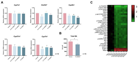 DMSO acutely inhibits bile acid (BA) synthase gene expression and reduces cellular BAs. (A) Expression of Cyp7a1, Hsd3b7, Cyp8b1, Cyp27a1, and Cyp7b1 in primary hepatocytes treated with 0.01%, 0.1%, and 1% (v/v) DMSO for 12 h. (B) Total BA levels in hepatocytes treated with 1% DMSO for 24 h. For panels (A,B), n = 6 for each group. (C) Heatmap of changes in cellular signaling pathways detected by a reverse-phase protein array (RPPA) in primary hepatocytes treated with 1% (v/v) DMSO for 10 min or 30 min. Protein intensities are displayed as colors ranging from green to red as shown in the key. All data are mean ± SEM; * p < 0.05, ** p < 0.01, *** p < 0.001, relative to the control group.