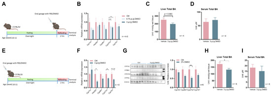 Encouraged by these positive data, we decided to determine whether DMSO administration to mice would suppress bile acid synthesis gene expression in the liver. We first administered 5% or 20% DMSO dissolved in water to C57Bl/6J wild-type mice at 15 µL/g body weight, which equals 0.75 µL/g or 3 µL/g body weight, in the morning after overnight fasting. Two hours after refeeding, hepatic expression of bile acid synthesis genes was evaluated (Figure 2A). Cyp27a1 was significantly suppressed by the higher dose of DMSO treatment, while Cyp7a1 and Cyp8b1 also showed a trend of decreasing expression but without statistical significance (Figure 2B). The inhibition of bile acid synthesis genes, translating to a mild 21.4% reduction in total liver bile acids (p = 0.083), while serum total bile acids were not affected (Figure 2C,D). When we extended the treatment duration to 24 h (Figure 2E), the higher dose of DMSO treatment (3 µL/g) still significantly repressed Cyp27a1, with additional inhibition of Hsd3b7 and Cyp7b1, suggesting the slow kinetics in inhibition of those genes by DMSO in mice (Figure 2F). The inhibition of mRNA translates to significantly reduced CYP27A1 protein levels in liver lysates revealed by Western blots (Figure 2G) and a 23.9% reduction (p = 0.023) in liver total bile acids (Figure 2H). However, serum total bile acid levels were still not affected by DMSO (Figure 2I).