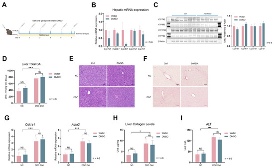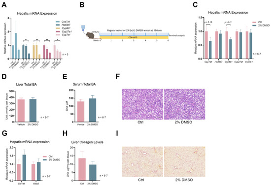 Lastly, given the rapid development of acute hepatic and systemic failure in the 0.1% DDC-diet mouse model, we employed another mouse model: CDA-HFD (choline-deficient, L-amino acid-defined, high-fat diet). Feeding mice a CDA-HFD is a widely used method of inducing liver fibrosis in as short as 6–9 weeks [22,23]. Due to the nature of the long-term treatment of CDA-HFD-induced liver fibrosis, we first tested a new approach other than the use of oral gavage to administer DMSO to mice. Adding DMSO to drinking water (2% v/v) was sufficient to suppress several bile acid synthesis genes to a similar degree of DMSO oral gavage (Figure 4A). Then, we treated a cohort of mice with CDA-HFD and with or without DMSO in their drinking water (Figure 4B). Gene expression analysis shows mild trends of reductions in hepatic Cyp7a1 and Cyp8b1 levels in the DMSO treatment group for mice treated with CDA-HFD for 6 weeks (Figure 4C). However, total liver bile acid and serum bile acid levels were not reduced by DMSO (Figure 4D,E), as seen in the DDC diet treatment experiment. CDA-HFD treatment leads to the accumulation of lipid droplets and the infiltration of inflammatory monocytes in the liver, but DMSO did not reduce the severity of those two processes (Figure 4F). Liver fibrosis levels, indicated by Col1a1 and Acta2 expression, and hepatic collagen levels were not different (Figure 4G,H). Sirius Red staining, which stains collagen fibers red, showed no difference in intensity between water- and DMSO-treated mice livers (Figure 4I).
