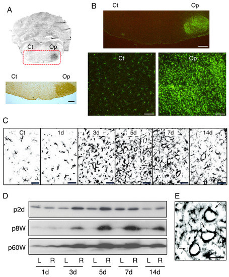 Increase in microglial cell number in the axotomized facial nucleus. (A). Amounts of microglia in contFN and axotFN. The right facial nerve was transected and 5 days later the brainstem sections were stained with anti-Iba1 antibody according to the ABC method. Ct, contFN; Op, axotFN. Scale bar = 400 μm. (B). Increase in microglia in the axotFN. The brainstem sections prepared as described above (A) were stained with anti-Iba1 antibody by the fluorescence method. Scale bar = 400 μm. High-power photos are shown in the lower panels. Scale bar = 100 μm. (C). Immunohistochemical analysis of the microglial cell number across time. The axotFN was stained with anti-CR3 antibody at 1, 3, 5, 7, and 14 days post-insult. Ct shows the contFN obtained at 5 days post-insult. Scale bar = 50 μm. (D). Immunoblot analysis of Iba1 in rats of different ages. The right facial nerve of a p2d-rat (p2d), p8W-rat (p8W), and p60W-rat (p60W) was transected, and the contFN (L) and axotFN (R) of each rat were immunoblotted for Iba1 across time. (E). Circular localization of microglia. Iba1-expressing microglia around injured motoneuron cell bodies at 7 days post-insult are shown (arrows). Scale bar = 50 μm.