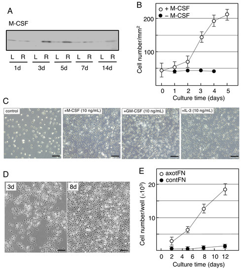 Induction of M-CSF in the axotomized facial nucleus and the effects of M-CSF on microglia. (A). Changes in M-CSF levels in the axotFN. The right facial nerve of adult rats was transected, and the contFN (L) and axotFN (R) of each rat were analyzed for M-CSF in immunoblotting at 1, 3, 5, 7, and 14 days post-insult. (B). Effects of M-CSF on microglial proliferation. M-CSF (20 ng/mL) was added to the microglial culture (2 × 104/well) and the cell number within a 1 mm2 area (○) was counted [90]. The cell number in the absence of M-CSF is shown as (●). The results are expressed as means ± SDs of three separate experiments. (C). Effects of M-CSF, GM-CSF, and IL-3 (multi-CSF). M-CSF (10 ng/mL), GM-CSF (10 ng/mL), and IL-3 (10 ng/mL) were added to microglial culture and maintained for 3 days. Scale bar = 50 μm. (D). Increase in the cell number of axotFN-microglia. AxotFN recovered at 3 days post-insult were subjected to explant culture [91]. The microglia attached to the dish were photographed at 3 and 8 days after-culture. Scale bar = 50 μm. (E). Proliferation of axotFN-microglia. The axotFN transected 3 days previously (axotFN; ○) and contFN (contFN; ●) were subjected to explant culture [91]. The emerged cells were counted at 2, 5, 8, and 12 days following culture. The results are expressed as means ± SDs of three separate experiments.