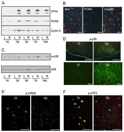 Cell cycle-related proteins and signaling molecules in the axotomized facial nucleus. (A). Changes in cell-cycle related proteins. Levels of cFms, PCNA, and cyclin A were analyzed in the contFN (L) and axotFN (R) recovered at 1, 3, 5, 7, and 14 days post-insult. (B). Expression of PCNA in proliferating microglia. The axotFN taken at 3 days post-insult was immunohistochemically dual stained with anti-Iba1(red) and anti-PCNA (green) antibodies. The merged photo is shown at right. Scale bar = 50 μm. (C). Transition of p-p38/p38 levels in the axotFN. The contFN (L) and axotFN (R) recovered at 1, 3, 5, 7, and 14 days post-insult were analyzed for p-p38 and p38 by immunoblotting. (D). Immunohistochemistry for p-p38 in the axotFN. Brainstem sections recovered at 5 days post-insult were stained with anti-p-p38 antibody. The contFN (Ct) and axotFN (Op) are shown in low (scale bar = 400 μm) and high magnification (Scale bar = 100 μm). (E,F). Immunohistochemistry for p-CREB and p-ATF2 in the axotFN. Brainstem sections recovered at 5 days post-insult were stained with anti-p-CREB antibody (E) and anti-p-ATF2 antibody (F). Note that the larger area of staining are nuclei of motoneurons, and the smaller stained points are nuclei of microglia. Scale bar = 100 μm.
