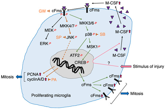 As described above, immunohistochemical analysis showed that microglia expressing p-CREB and p-ATF2 were significantly enhanced in the axotFN. An in vitro experiment also documented that the levels of p-CREB and p-ATF2 were enhanced in M-CSF-stimulated microglia (partially unpublished). In addition, mitogen- and stress-activated kinase-1 (MSK1) was recognized to be phosphorylated in M-CSF-stimulated microglia in vitro [109]. Since MSK1 is phosphorylated by p38 [118,119] and the activated MSK1 (p-MSK1) in turn activates CREB [120], the p38–MSK1–CREB signaling cascade is assumed to serve in microglial proliferation. ATF2 was also phosphorylated in M-CSF-stimulated microglia in vitro, and a link between p38 and ATF2 was reported in microglia in an LPS-induced neuroinflammation model [114], suggesting the existence of a p38–ATF2 pathway in M-CSF-dependent microglial proliferation. Thus, it is plausible that p38–MSK1-CREB and/or p38–ATF2 cascades are involved in microglial proliferation through the induction of cFms [90].