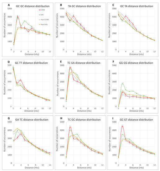Standard deviation (σ) and average values for DN spacing distances were calculated from 1000 subsets of WG, randWG, and randUCNE sequences. These statistics have been calculated using Perl module Statistics::Basic (Version 1.6611), (Miller, P. 2014, Retrieved from https://metacpan.org/dist/Statistics-Basic/view/lib/Statistics/Basic.pod, accessed on 6 August 2023) inside our Perl program 1000_dint.pl. The σ for 1000 random subsets (randUCNE, randWG) is solely due to the limited size of each subset (1.4 million nucleotides). In contrast, σ for 1000 WG subsets is partially due to the limited size of each subset (which has the same size of 1.4 million nucleotides), plus variations in DN frequencies distributions and GC-content in each WG subset. Comparison of σ of WG versus randWG demonstrated that σWG is only slightly larger than σrandWG (by no more than 20%). Hence, the most impact on σ comes not from the fluctuations of GC-composition of individual WG sequences but due to the limited size of the sample. Therefore, we assumed that σUCNE should be the same as σWG, because they have the same size of 1.4 million nucleotides and both subsets have variations in nucleotide compositions of individual sequences. This conjecture has been tested via the comparison of UCNE DN spacing distributions on complementary strands (such as TT-GA versus TC-AA DN spacing distributions, as demonstrated in the results section). Examinations of complementary pairs demonstrated that our σUCNE evaluations are correct, and the fluctuations are in 68% of the time within 1 σ. These 3xσUCNE are plotted in the figures in the Results section.