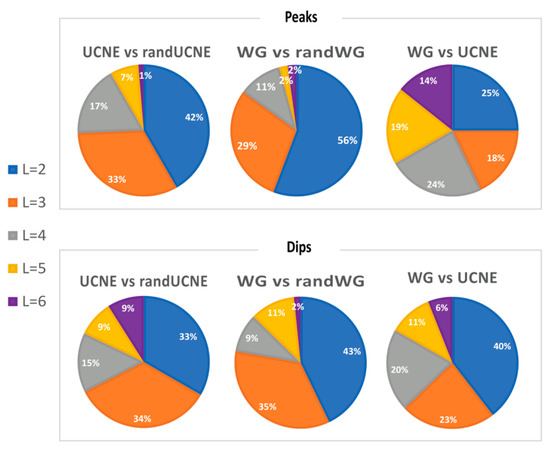 When RPD exceeds 10%, the difference is statistically significant with at least 3 times the standard deviation certainty (p-value 0.003). For many DN pairs with this threshold, statistical significance is over 5σ (p-value 3 × 10−7). Table 2 presents the fraction of all possible DN pairs where RPD exceeds 10%,20%, 30%, and 40% for at least one spacing distance L in the range of 2–12 nts. Table 2 demonstrates that non-randomness in DN spacing arrangements exists for ≥83% of DN pairs with RPD > 10%. Additionally, in over one-third of the possible DN pairs, the RPD reaches 20% and, occasionally, even exceeds 40% of RPD values. This suggests that the non-randomness in DN spacing is comparable to the non-randomness of genomic signatures for adjacent nucleotides, as introduced by Karlin and Burge [6]. Moreover, the strongest effect of DN spacing is not limited to adjacent DN pairs (L = 2 nt) but frequently occurs at other distances within the range of 2–7 nucleotides. For example, in Figure 2B–D, UCNE exhibits RPDL=4 peaks of approximately 20% over WG, while Figure 2E shows a UCNE dip for RPD4. To account for the effect of the distance L on the non-randomness of DN spacing, we calculated at which L value a maximum (peak) and minimum (dip) are observed for each DN pair, as described in the Materials section. These calculations are shown in Figure 3. On average, peaks or dips in 40% of the cases occur at L = 2, in 29% of the cases at L = 3; in 16% at L = 4; in 10% at L = 5; and 5.7% at L = 6.