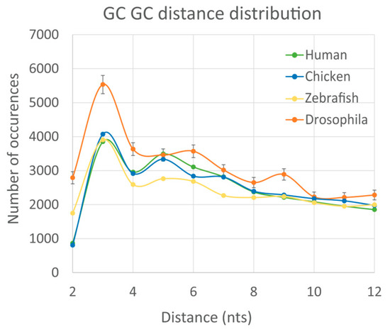 Finally, we calculated the non-randomness of DN spacing for WG of other species (chicken, zebra fish, and fruit fly) and compared them with human. The results are presented in the Supplementary Table S2, while one example for the GpC-GpC DN pair is illustrated in the Figure 4. This figure demonstrates that the DN spacing non-randomness is practically identical between human and chicken. In zebrafish, we observed the overall similarity to the human-chicken non-randomness, yet with noticeable fluctuations. However, for the Drosophila genome the distribution pattern significantly changes. Specifically, a prominent dip at L = 4 is absent, while species-specific small peaks at L = 6 and L = 9 are detected in fruit fly (see Figure 4).