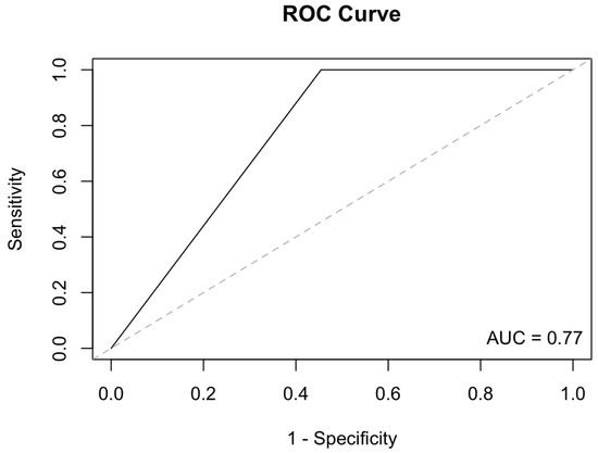 In the NLUTD patients with detected methylation, the statistical analysis showed 100% sensitivity, 55.88% specificity, a 100% negative predictive value and an 11.76% positive predictive value in this panel of genes for BCa diagnosis. The area under the curve (AUC) of the panel was estimated at 0.77 for BCa diagnosis (Figure 2). The diagnostic performance of the cystoscopy in the NLUTD group was 50% sensitivity, a 58.97% specificity, 95.83% negative predictive value and a 5.88% positive predictive value; the sensitivity of wash cytology was 0%.