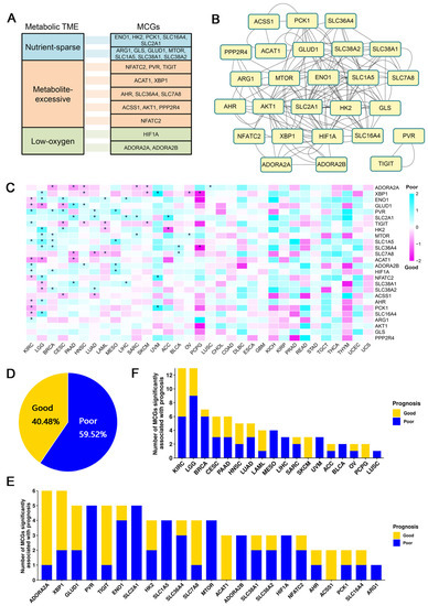 Global identification of survival-related metabolic checkpoint genes. (A) Twenty-six metabolic checkpoint genes were classified based on their functional role in the tumor microenvironment. (B) Interacting network diagram of metabolic checkpoint genes, where the lines represent interactions between genes. (C) Heatmap of the regression coefficients of the Cox regression model of the metabolic checkpoint genes. Coefficient greater than 0 indicates that the expression of metabolic checkpoint genes increases the risk of patient death, while a coefficient less than 0 indicates that the expression of metabolic checkpoint genes decreases the risk of patient death. * indicates a significant association between the metabolic checkpoint gene and cancer prognosis. (D) Ratio of good or poor survival-associated pairs of metabolic checkpoint gene and cancer. (E) Number of cancers with prognosis-associated metabolic checkpoint gene. (F) Number of metabolic checkpoint genes associated with survival of each cancer.