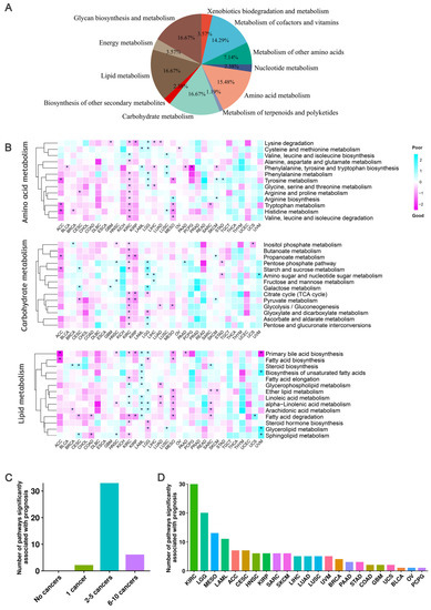 Correlation of 41 metabolic pathways from three primary categories and cancer survival. (A) A total of 84 metabolic pathways from 11 major metabolite-related subtypes defined by KEGG were used. (B) Heatmap of the regression coefficients of the Cox regression model of the three main metabolite-related pathways. A coefficient greater than 0 indicates that the metabolic pathway increases the risk of patient death, while a coefficient less than 0 indicates that the metabolic pathway decreases the risk of patient death. * indicates a significant association between the metabolic pathway and cancer prognosis. (C) Bar chart showing the total number of metabolic pathways significantly associated with a specific number of cancer prognoses in the three main metabolite-related pathways. The height of the bar represents the total number of metabolic pathways significantly associated with a specific number of cancer prognoses. (D) Statistics of the number of major metabolite-related metabolic pathways significantly associated with cancer prognosis in each cancer type.