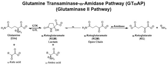 The GTωA (glutaminase II) pathway. Note the involvement of two enzymes—an l-glutamine transaminase and ω-amidase—that are involved in the production of ammonium from l-glutamine. Note also the equilibrium between open-chain (ω-amidase substrate) and lactam forms of KGM. KGM greatly favors the lactam form. GTK and GTL are glutamine transaminases (see Section 3 below).