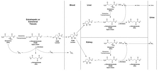 As a result of incomplete hydrolysis of KGM in extrarenal and extrahepatic tissues, KGM accumulates in the blood. As noted above, the concentration in rat blood is ~19 μM. We suggest that once in the circulation, a portion of this KGM is taken up by the liver, where it enters a larger pool of KGM (~216 μM in rat liver [25]). This pool of KGM can then theoretically act as a source of ammonium for urea synthesis, for glutamine synthesis, or for both (Figure 3). Thus, in future studies, it will be important to determine whether ω-amidase is present in the urea-cycle-containing periportal hepatocytes, the glutamine-synthetase-containing perivenous hepatocytes, or both. In addition, it is possible that a portion of the blood-borne KGM is also taken up by the kidneys, where it can be excreted as ammonium ion as part of acid–base regulation by the kidneys; the possible involvement of the GTωA pathway in this process is briefly discussed in reference [3]. It is known that, in the rat kidney, GTK is confined largely to the proximal tubules—see references quoted in [3]. In future work, it will be important to determine the cellular location of ω-amidase in rat kidney and its location relative to GTK. We hypothesize that, notwithstanding the lack of current knowledge regarding the exact cellular location of ω-amidase in the liver and kidney, KGM is an important “player” in the maintenance of nitrogen homeostasis in mammals.