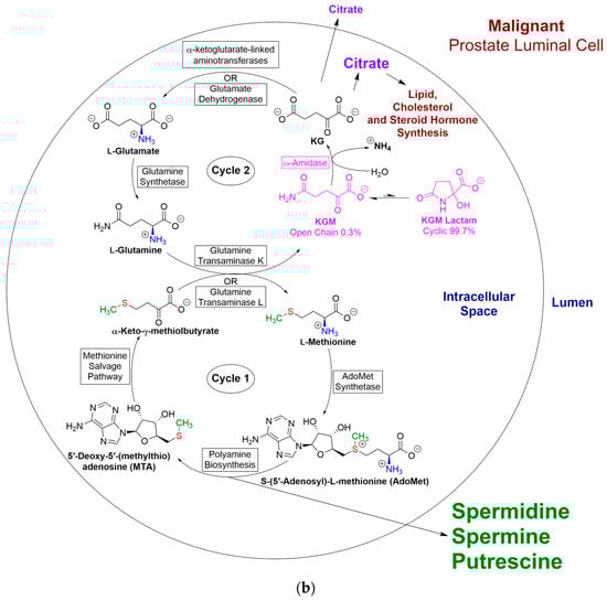A major route for l-methionine metabolism involves its conversion to S-adenosyl-l-methionine (SAM). SAM is the major methyl donor in vivo. However, a substantial portion of SAM is also involved in polyamine biosynthesis. During polyamine biosynthesis, carbon 1 of l-methionine is converted to CO2, and carbons 2–4 and the amine nitrogen are incorporated into polyamines, whereas the sulfur and methyl group are incorporated into 5′-methythioadenosine (MTA). In order to prevent a drain of potentially scarce sulfur and methyl moieties, a salvage pathway arose early in evolution that is widespread in nature, occurring in unicellular bacteria, archaea, fungi, and in mammalian and plant cells (e.g., [77,78]). This pathway converts MTA to l-methionine. During this process, the original sulfur and methyl moiety are retained in the newly formed l-methionine, whereas carbons 1–4 are obtained anew from the ribose portion of MTA. The intermediates in the salvage pathway were brilliantly elucidated by Abeles and colleagues at Brandeis University in the 1990s [79,80,81]. Notably, the last step of the pathway is closed by transamination of KMB to l-methionine with a suitable amino acid. It has been known for over 40 years that, in rats, transamination of KMB occurs with l-glutamine and, to a lesser extent, with l-asparagine [82]. Moreover, an l-glutamine transaminase homologue and ω-amidase potentially act in tandem to close the methionine salvage pathway in bacteria and plants [83].