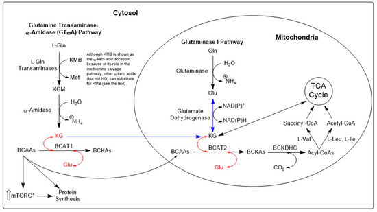 A considerable number of studies cite the importance of BCAAs in nitrogen transfer within and between cells and tissues and demonstrate the metabolic interplay in protein and energy metabolism and nutrient signaling in mammalian targets of rapamycin (mTOR) activity, (e.g., [129]). The possible role of BCAAs in cancer cells is discussed in more detail in Section 13.