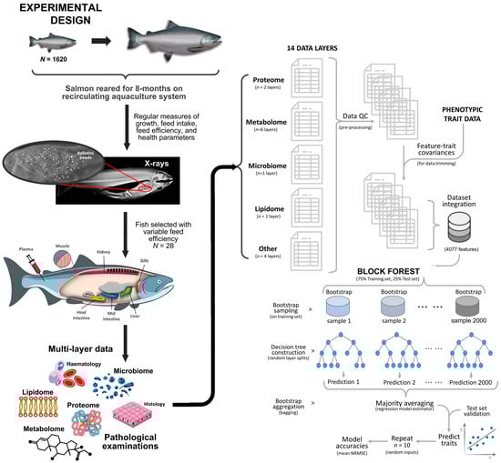 Herein, we utilise the powerful Random Block regression-based method to integrate 14 layers of covariate information obtained from the analysis of matched samples from individual fish displaying a continuum of FE. Our primary aim was to explore utility of leveraging multiple omics and clinical covariates for the prediction of FE phenotypes in farmed salmon. We further sought to extend application of this rich meta-dimensional data for the prediction of other performance-based traits related to feed intake and growth. Our specific objectives were to: (1) establish associations among the different data modalities, (2) construct a suite of trait prediction models and benchmark their accuracies, (3) evaluate relative contributions each information layer provides for predicting the different traits, and (4) gain new insights into mechanisms underpinning feed efficiency.