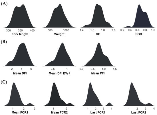 Performance-based trait distributions of salmon (O. tshawytscha) used as response variables in the Random Block models, comprising measures of growth (A), feed intake (B), and feed efficiency (C).