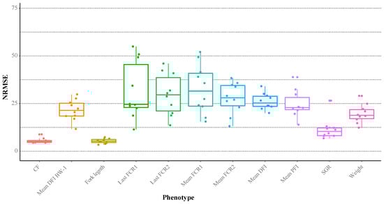 Boxplots of the normalised root-mean square error (NRMSE) in the Random Block phenotype prediction models based on all layers. Data points correspond to the result of each model iteration.
