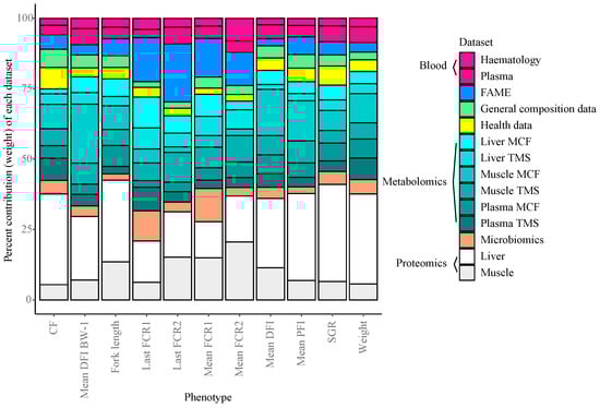 During construction of the integrated Random Block models, specific selection probabilities are calculated for each of the different layers. Using these values, the average relative contribution each information layer provides for predicting the phenotypic traits in the Random Block models were assessed (Figure 5). Overall, the datasets which contributed most to trait prediction were the liver and muscle proteomics data, as well as the muscle and plasma MCF and TMS metabolomics data. This aligns with the importance of metabolic processes underlying growth performance variation. Whole body lipid composition (fatty acid (FAME) data) played a greater role in predicting FE phenotypes compared to other performance metrics in general, and faecal microbial composition played a larger role in model performances in two of the four FE measures. Associations between fatty acid profiles and FE have previously been found in cattle [66], yet such relationships in fish are currently unknown [19].
