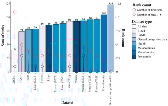 Global performance of the integrated datasets with combined modalities versus individual dataset in predicting phenotypes was assessed by ranking the NRMSE results per dataset per phenotype and by summing these ranks (Figure 6). The integrated data and the general composition layer had by far the lowest (N = 40) and highest sum of ranks (N = 123), respectively, while differences between the other datasets were more subtle. Interestingly, the models from the integrated data rank first only once but were consistently among the top five performers. In a relatively similar study on the prediction of phenotypic traits in potato using multi-omics data [67], integration of data layers did not enhance Random Forest model accuracies much more than when using individual layers. Layer contributions to trait prediction accuracies will undoubtedly depend on the biological system under investigation. In the current study, although many inter-layer covariate correlations exist, the substantial gain made by integrating the datasets indicate that some of these layers harbour unique information and are not redundant towards prediction of growth performance traits in fish. To summarise, considerable improvements in trait prediction accuracies were made by utilising all data rather than any single data modality alone.