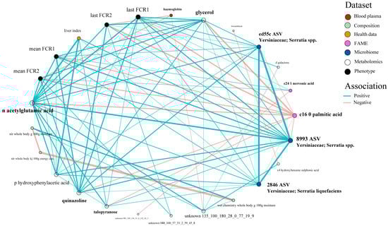 Looking more closely at the highest ranked co-occurring variables important to the best-performing Random Block models for FE, scope exists to gain mechanistic insight into FE variation. Many of these important predictor variables (N = 27) which originated from the integrated data were shared among all four FE trait prediction models (Figure 7). Interactions between this subset of variables and FE values were further assessed via correlation analyses (Figure 8) and a co-occurrence network (Figure 9), which additionally highlight some feature associations across the different data layers. These analyses notably show that three bacterial ASVs (i.e., ‘x8993’, ‘ed55c’ and ‘x2846’) from the family Yersiniaceae (genus Serratia) were negatively correlated with overall mean FE (r = −0.51 to −0.64; p-values < 0.01). Serratia spp. also formed positive correlations with N-acetylglutamic acid, hepatosomatic/liver index, and quinazoline, and a negative correlation with palmitic acid; all are significantly correlated to FE values. Members of Yersiniaceae are known fish pathogens [69,70,71,72,73], and their higher abundance in faeces of salmon with poor FE may indicate the existence of an intestinal infection/disease-related association.