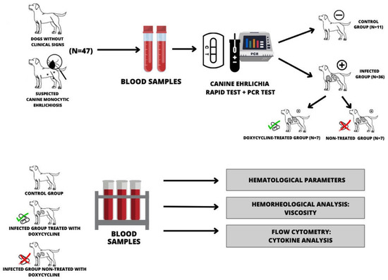 Blood samples were collected from 47 dogs, with different ages (>1 year) and no distinction of sex or breed that were haphazardly selected and evaluated in the city of Barra do Garças, State of Mato Grosso, Brazil (−15.8891, 15°53′24″ South, −52.2634, 52°15′24″ West). Regardless of disease stage, dogs with at least three clinical signs of CME were initially subjected to rapid serological testing. Of the total, 36 dogs with suspected CME were positive in commercial serological test kits (Alere®, Waltham, MA, USA). Next, E. canis-positive animals were tested via PCR to detect E. canis-specific DNA. All animals positive in rapid serological tests and confirmed by PCR were included in the study. Dogs that showed clinical signs of CME but tested negative in the PCR test, dogs that tested positive for Leishmania sp., Babesia sp., dogs under one year old, and dogs whose owners did not give permission were not included in the study. Finally, dogs were treated for CME with doxycycline (Syntec, São Paulo, Brazil) at 10 mg/kg every 12 h for 28 consecutive days [25]. Seven dogs returned for blood collection immediately after completing doxycycline treatment. According to the results of the diagnostic tests, clinical signs of the disease, and treatment adherence, the following groups were formed: dogs in the control group, negative for E. canis in both tests and without clinical EMC signs (N = 11); dogs infected by E. canis, reactive in both tests, and untreated (N = 7); and dogs reactive in both tests for E. canis and treated with doxycycline (N = 7). The scheme for obtaining samples and experimental design is described in Figure 1.