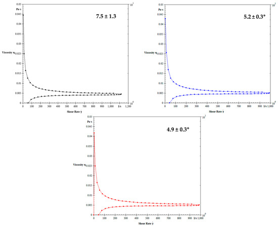 Blood viscosity of the noninfected dogs (black color), infected dogs (blue color), and infected dogs treated with doxycycline (red color). * p < 0.05 difference between noninfected dogs (control) with the infected dogs (treated or not with doxycycline). ANOVA test followed by Tukey test was used post-test.